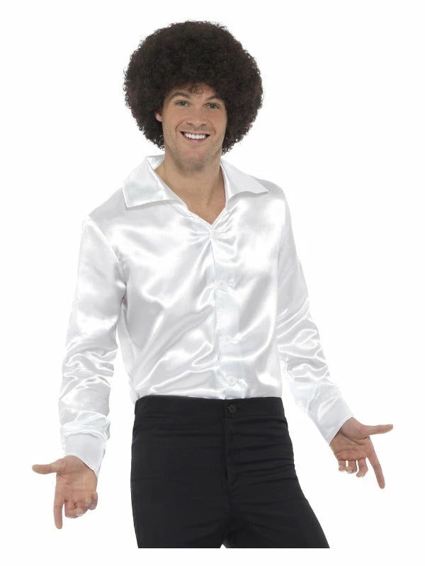 Disco in style in this 60’s / 70’s disco style shirt. This white satan shirt looks great on everyone. With oversized collars and shiny texture. All you need is the flares and you’ll be discoing in no time!