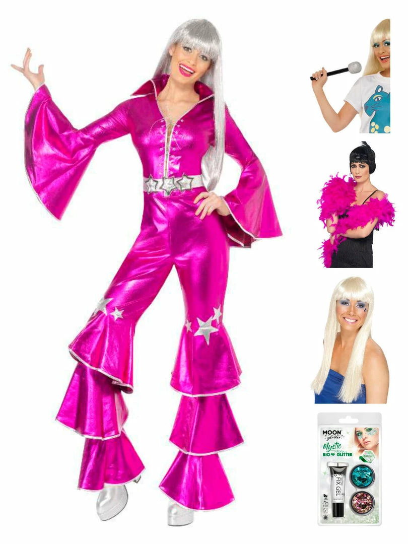 Keep the Eurovision alive in this Sweedish inspired 70’s disco fancy dress costume. Costume includes a lace up jumpsuit. You’ll be the dancing queen all night!