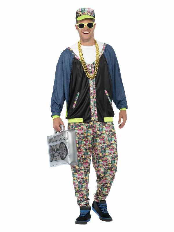 Boots ‘n Cats the night away in this 80’s hip hop costume. This 90’s attire comes with patterened jacket, trousers & hat. Complete the look with an inflatable boom box!