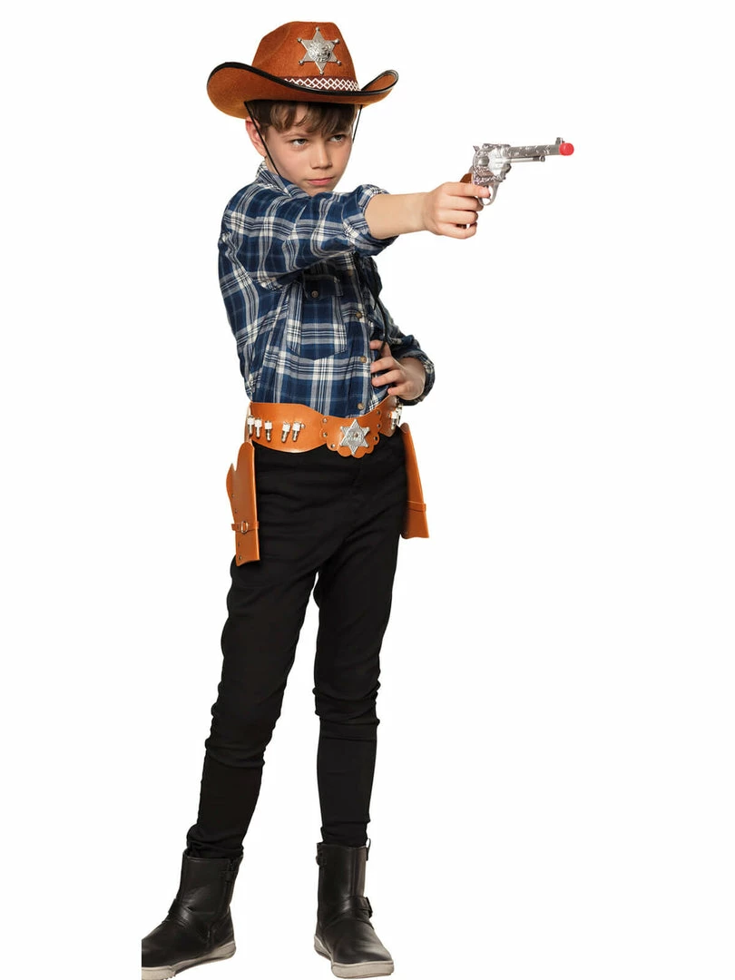 Cowboys will look the part with this realistic looking Sheriff pistol in silver with a brown leather look handle.