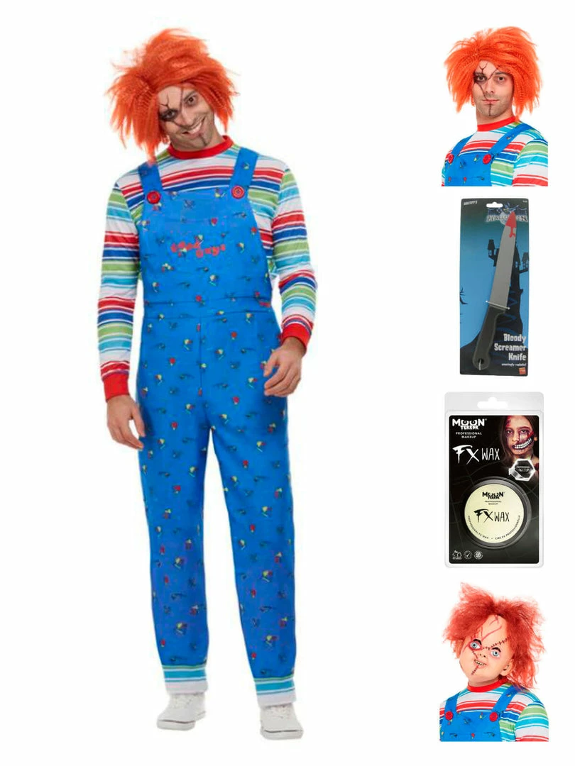 You’ll WANNA PLAY in this man size Chucky costume! Complete with printed blue dungarees and striped top, creaping people out will be Childs Play! Finish your costume with a Chucky mask.