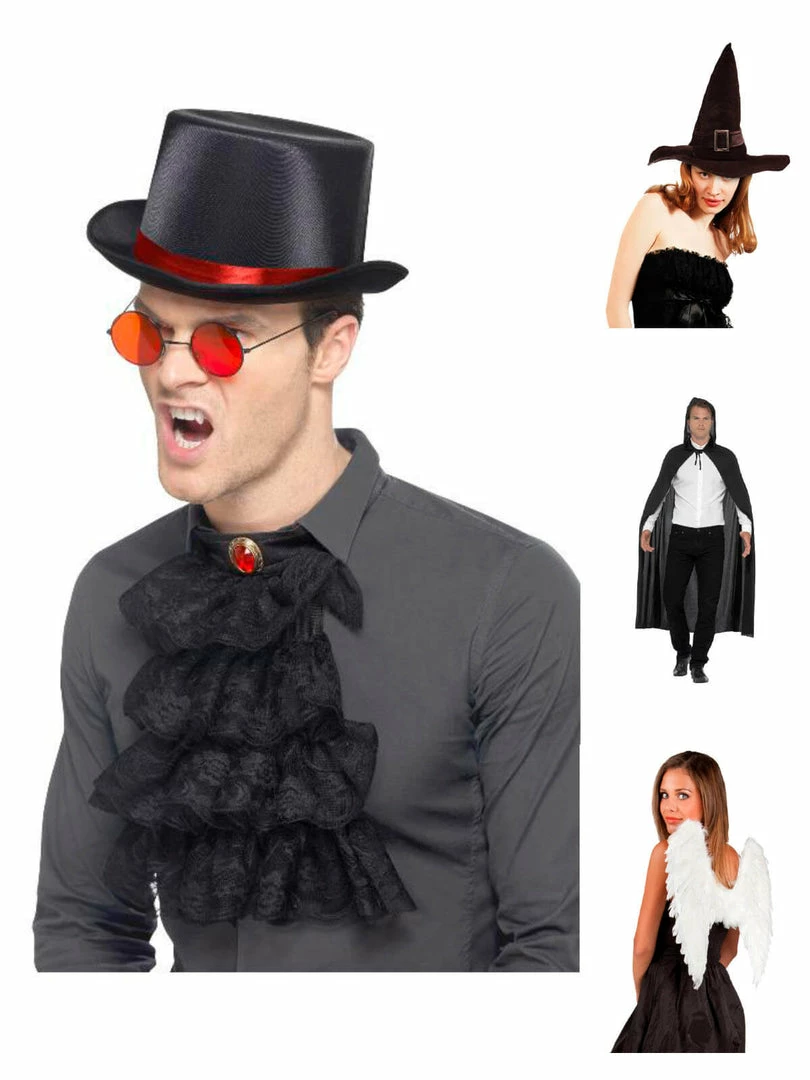 Create your own Gothic Vampire look with this Gothic kit. Complete with Top Hat, Glasses & Neck Ruffle. Great for Halloween and Bram Stoker festival!