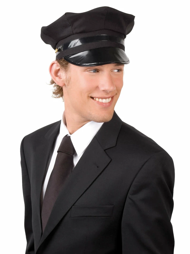 We hope you get some tips in this Chauffeur Hat. All black with shiny peek.