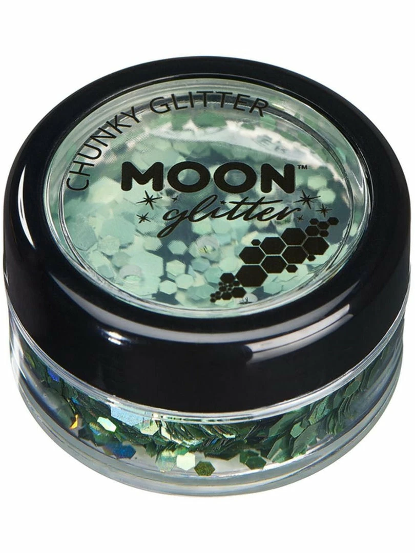 Moon Glitter. Chunky Holographic Glitter in various colours to be used on face or body. Perfect for Festivals, Clubbing, Parties, Pro beauty make up looks and face painting. Apply by putting on a base that will stick the glitter on, you can even use vaseline. Once on, you can build up colours and different sizes of glitter to get that chunky glitter festival look!