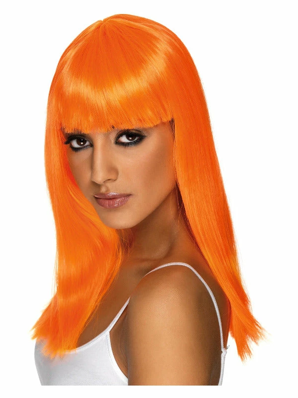 Be the person you want to be in this extremely versatile wig! This long Neon orange wig, straight with with fringe will glam you up in no time! Great for cosplay.