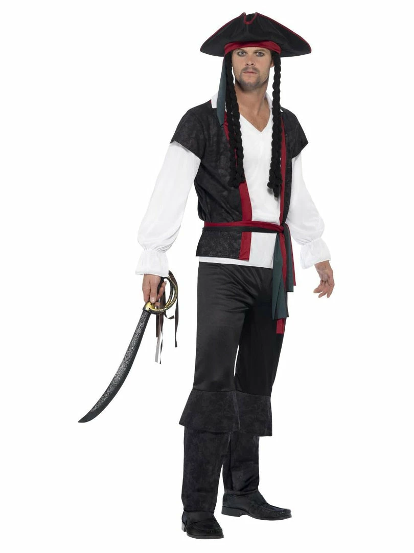 This complete Pirate costume is the perfect outfit for all you swashbuckling folk! It comes with top, trousers, tie & hat with hair.