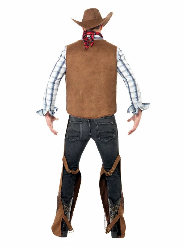 Be part of the wild wild West in the Cowboy Costume with fringing. This outfit includes a waistcoat, chaps, neckerchief and hat.