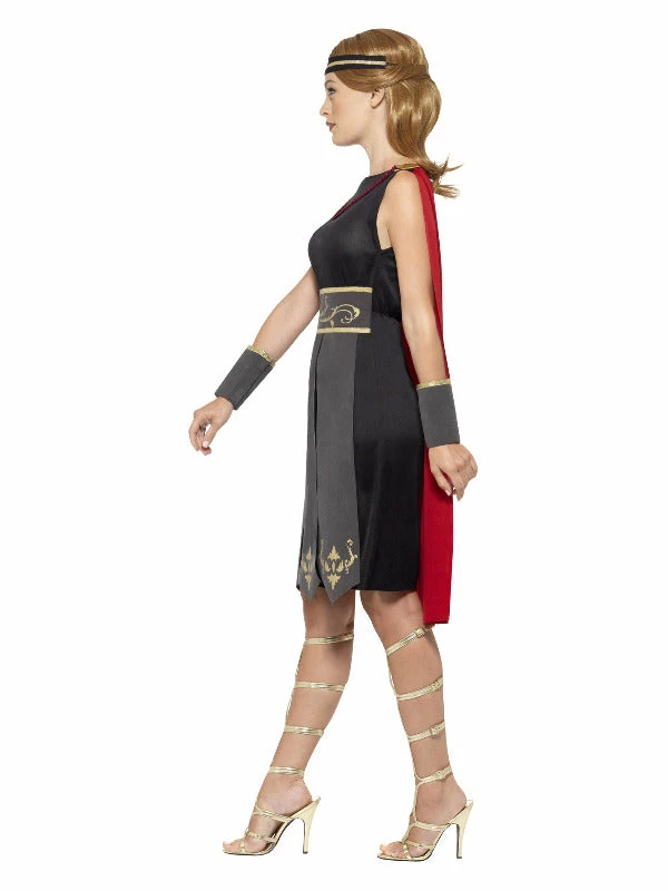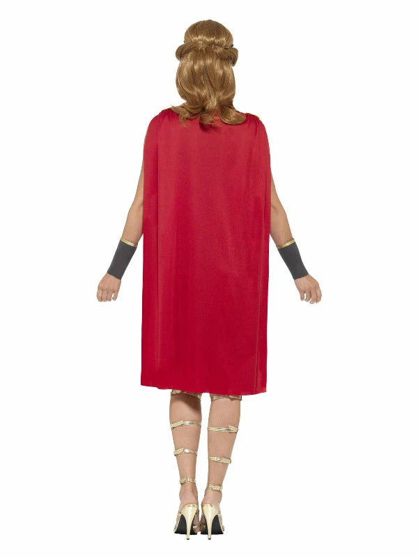 Train for battle in this Roman warrior costume. Costume comes complete with dress and attached cape, armcuffs and headband. Accessorise with a sword and some gladiator sandals.