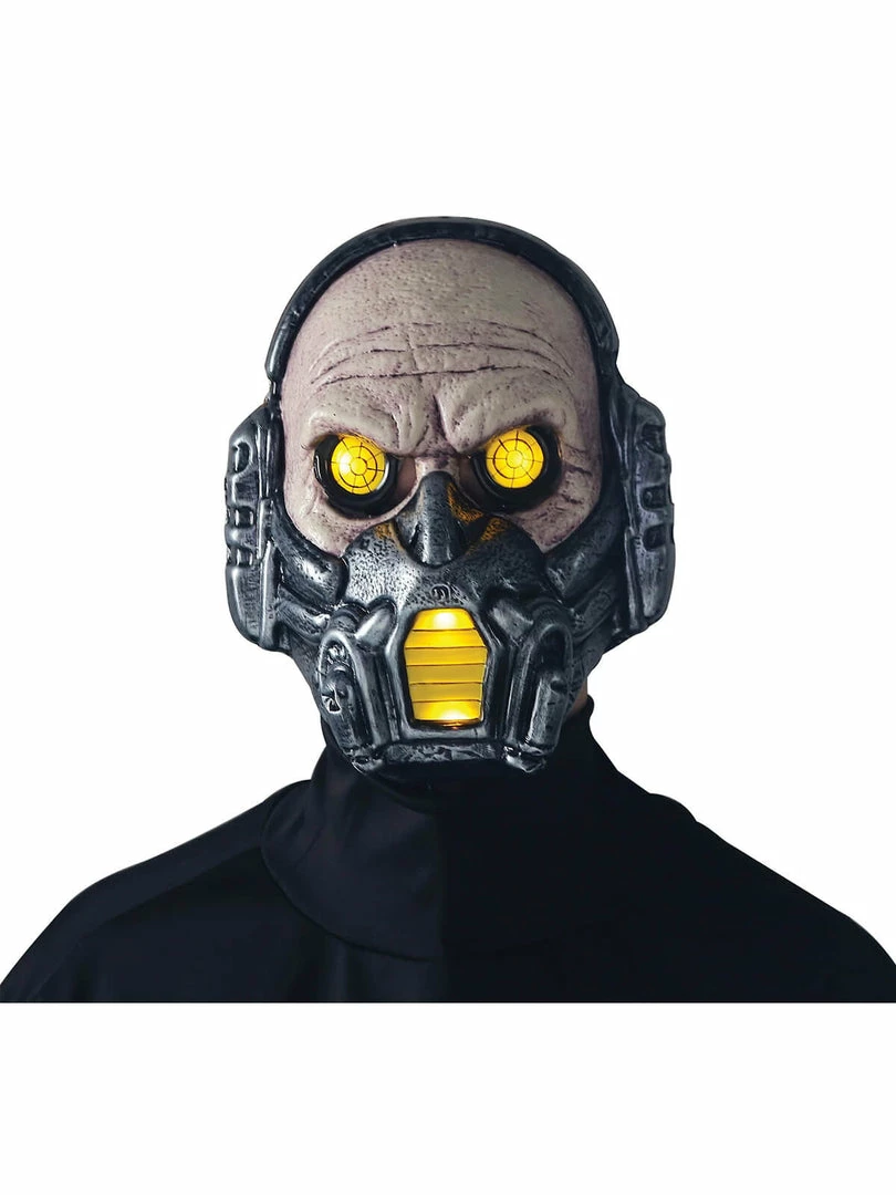This Light-Up Apocalypse Mask is a Vacuform mask with LED lights behind the eyes & mouth. It’s made of soft EVA lining & elastic Strap. 2 x AAA batteries included.