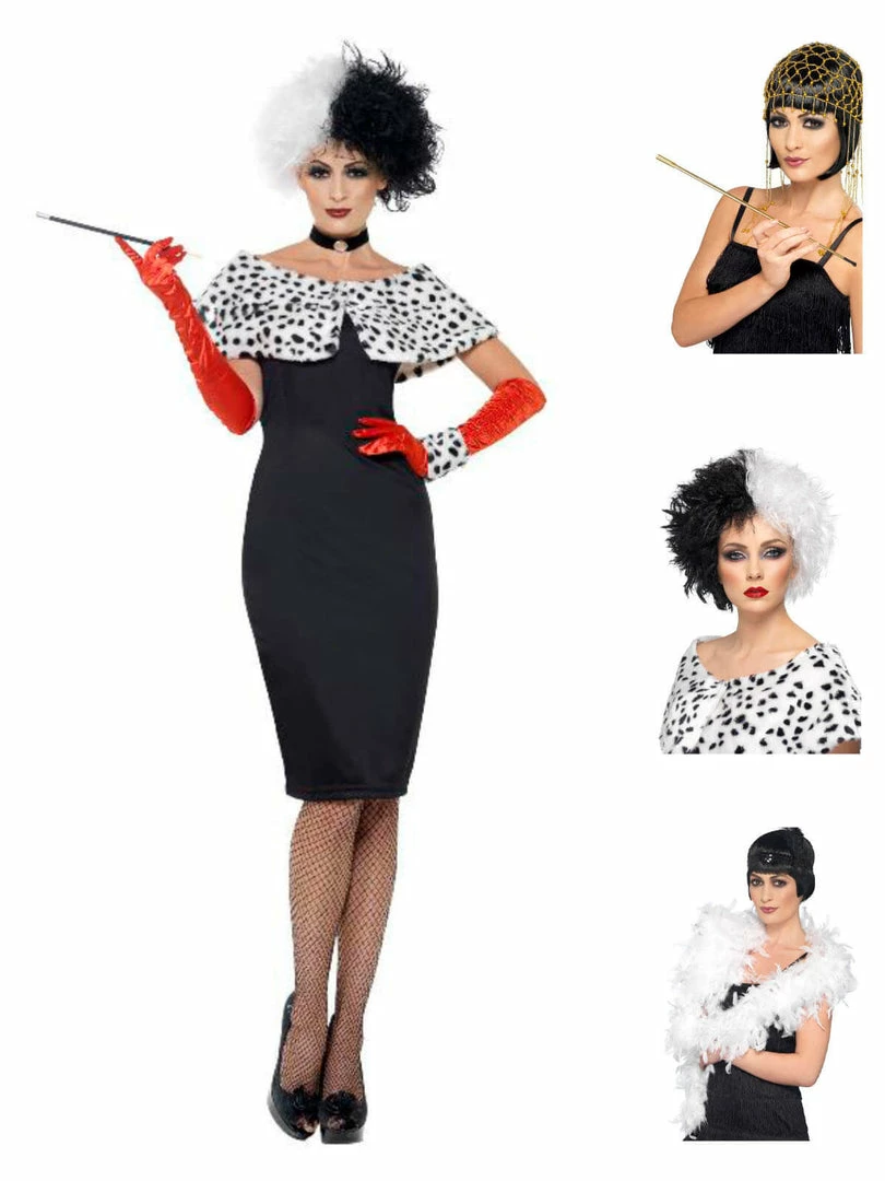 Let the dogs out and play the evil madame in this black and dalmation print wiggle dress. This costume comes complete with dress, gloves, shrug, cuff and choker. Complete the look with a 2 tone wig and a ton + 1 of dogs!