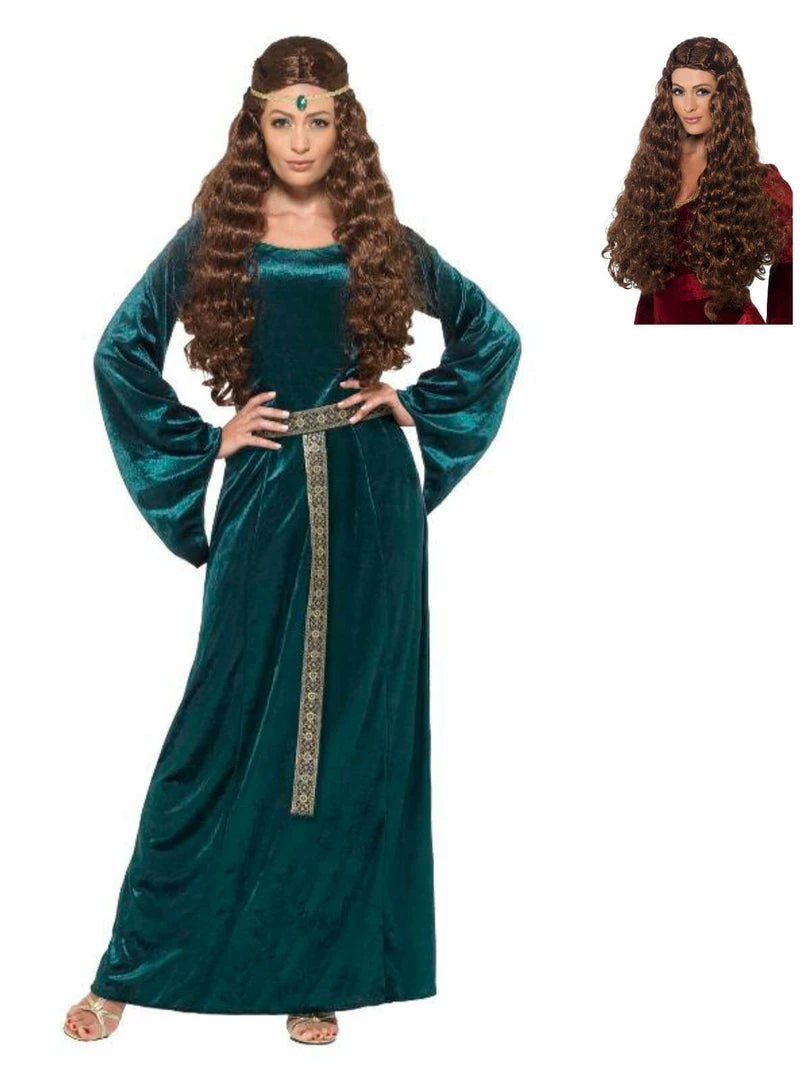 Step straight out of the medieval times in the Medieval Maid Costume. The green velvet looking dress has wizard sleeves comes complete with a headband.