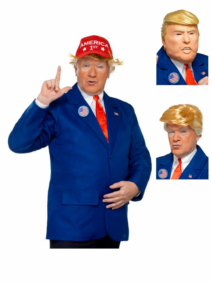 MAKE AMERICA GREAT AGAIN and become one of the most hated men on Earth in this American President fancy dress costume. Costume comes complete with Blue jacket, pin, red tie & hat