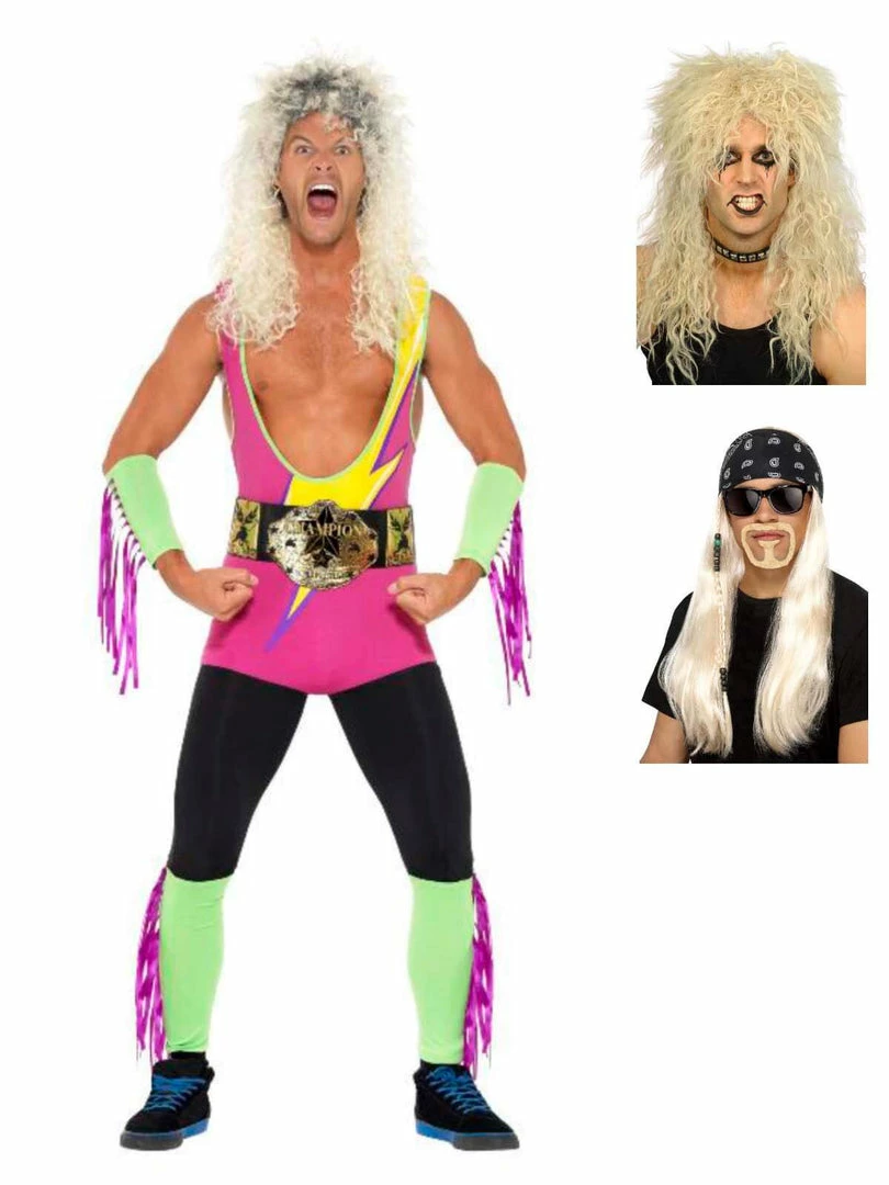 Get ready to rumble in this 80’s style wrestler fancy dress. This hilarious multicoloured costume comes complete with bodysuit, belt, arm & leg cuffs. All you need now is an 80’s wig and lots of attitude! Great for stags, festivals and funny Halloween!