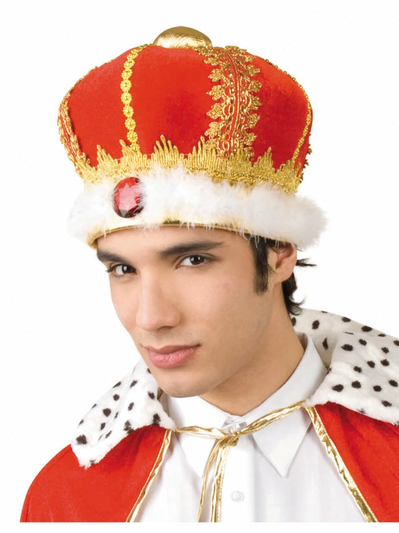 Become HYH in this Royal King Crown is a traditional crown shape with red felt, white trim, and gold detailing.
