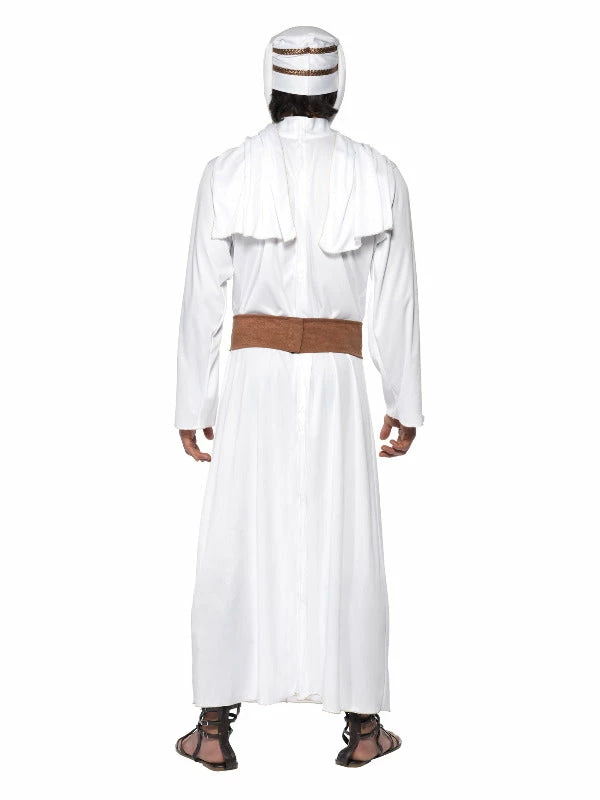 This realistic Lawrence of Arabia Costume consists of a long white hooded gown, headpiece and belt. Complete your look with a Sword and Gladiator Sandals. Camel not included!