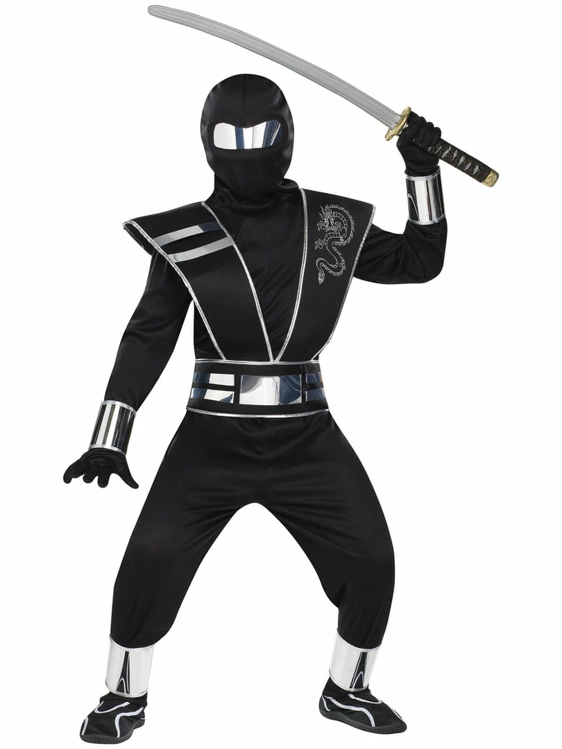 POWER up & go in this Black Ninja costume. You’ll be the ultimate fighting machine ready to take on your enemy. Costume includes Hooded shirt, Trousers, Face mask, Belt, Arm & Leg Pads.