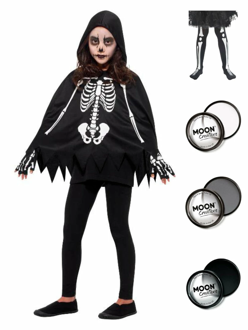 Make no bones about it, this skeleton kit will have kids dressed up in seconds! Complete with a black hooded poncho and gloves. Complete the costume with a skull make up look.