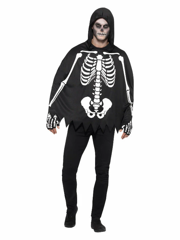 Make no bones about it, this unisex skeleton kit will have you dressed up in seconds! Complete with a black hooded poncho and gloves. Complete the costume with a skull make up look.