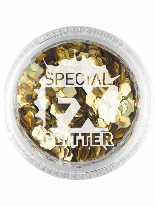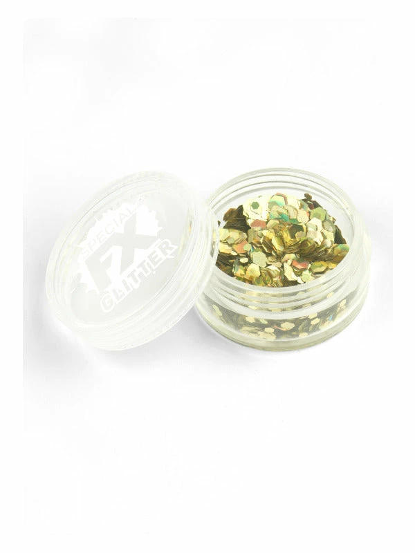 This large Gold confetti glitter is so versatile for many looks. Stick to skin with any skin adhesive for an avant garde look.