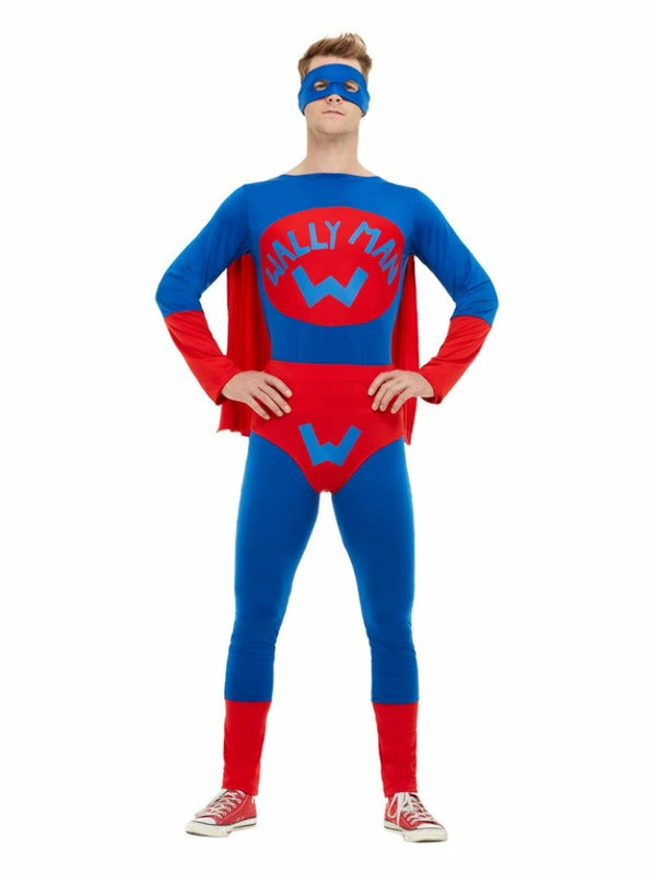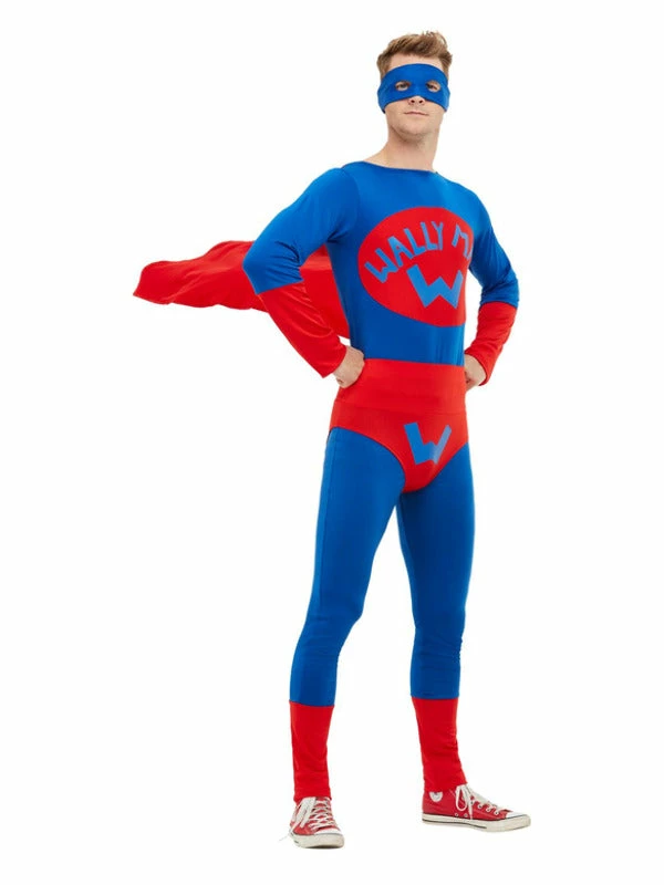Be the ultimate Wally in this Wallyman Costume. Fight crime or do whatever it is you Wally’s do!. Complete with blue & red jumpsuit, cape, eyemask and overpants.